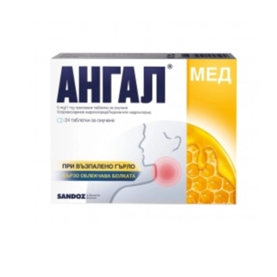 Ангал мед таблетки за смучене при възпалено гърло 5мг/1мг х24