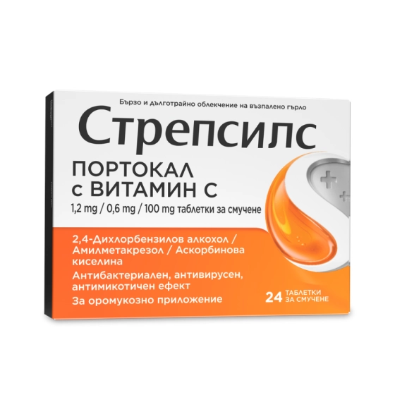 Стрепсилс портокал и витамин C таблетки за смучене при възпалено гърло x24